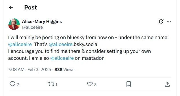 23 January 2026Independent Senator (NUI) and Leader of Seanad Civil Engagement Group Alice-Mary Higgins has confirmed that she has left X. She hasn’t posted on the platform since Feb 3rd 2025 and in her final post she encouraged others to also switch.