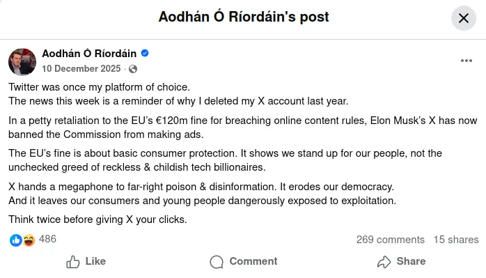25 January 2026Dublin MEP and Labour Education & Justice Spokesperson Aodhán Ó Ríordáin left X over a year ago. In a Facebook post last December Aodhán posted a ‘reminder of why I deleted my X account last year’ indicating that he may have left the platform in 2024.