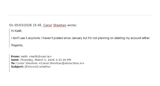 12 March 2026Labour TD Conor Sheehan has joined the majority of his party colleagues and is no longer using X. Unlike other Labour TD’s most of whom have posted a note in their bio deputy Sheehan has made no comment on the platform but hasn’t been active on the site since the 9th of January. In a response to an email query he stated: